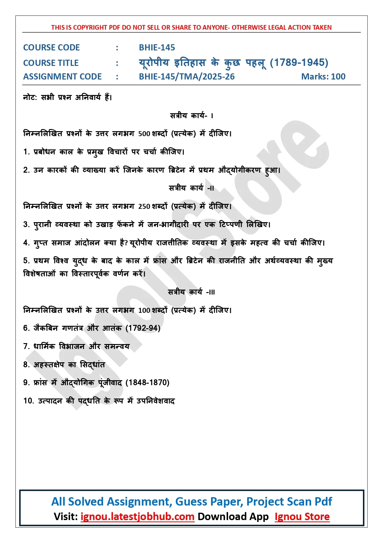 IGNOU BHIE-145 Solved Assignment 2025-26 PDF | यूरोपीय इतिहास के कुछ पहलू (1789-1945)