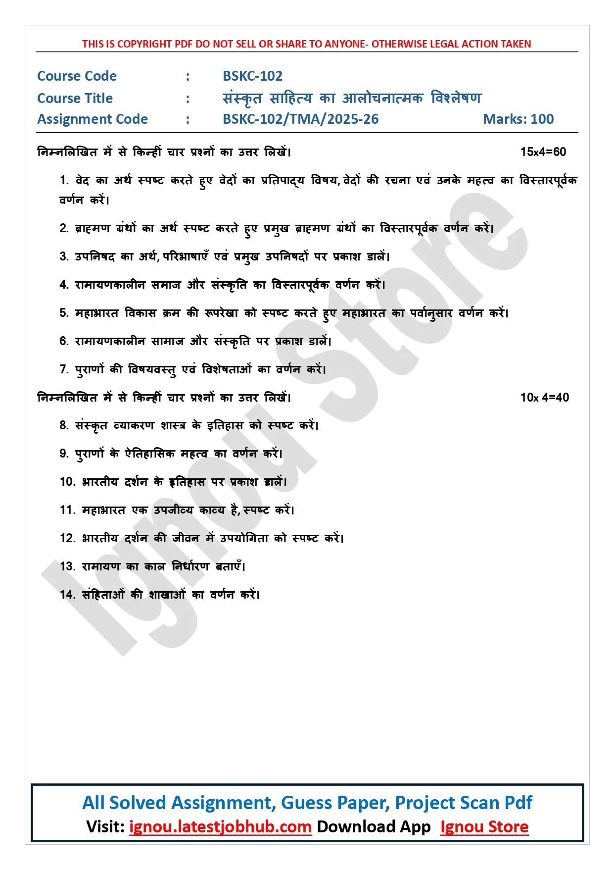 IGNOU BSKC-102 Solved Assignment 2025-26 PDF | संस्कृत साहित्य का आलोचनात्मक विश्लेषण
