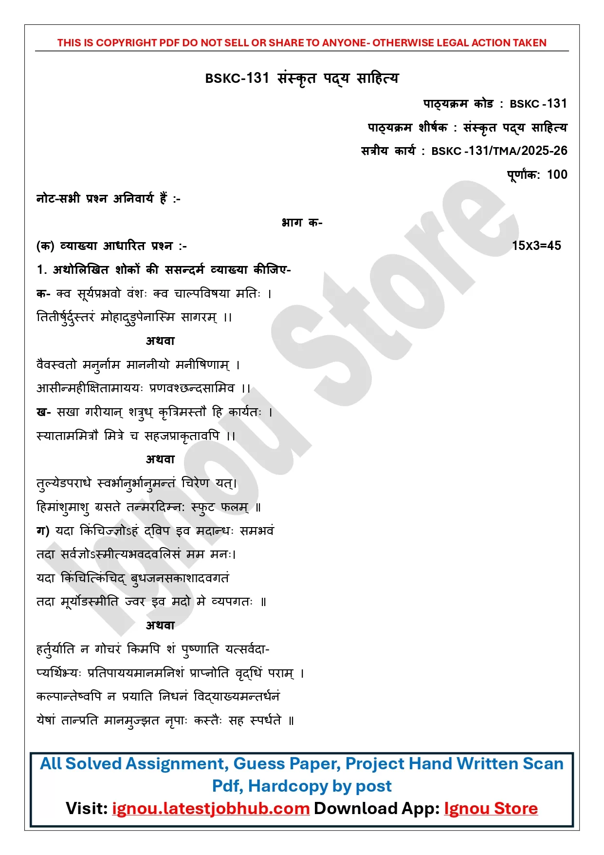 IGNOU BSKC-131 Solved Assignment 2025-26 PDF | संस्कृत पद्य साहित्य