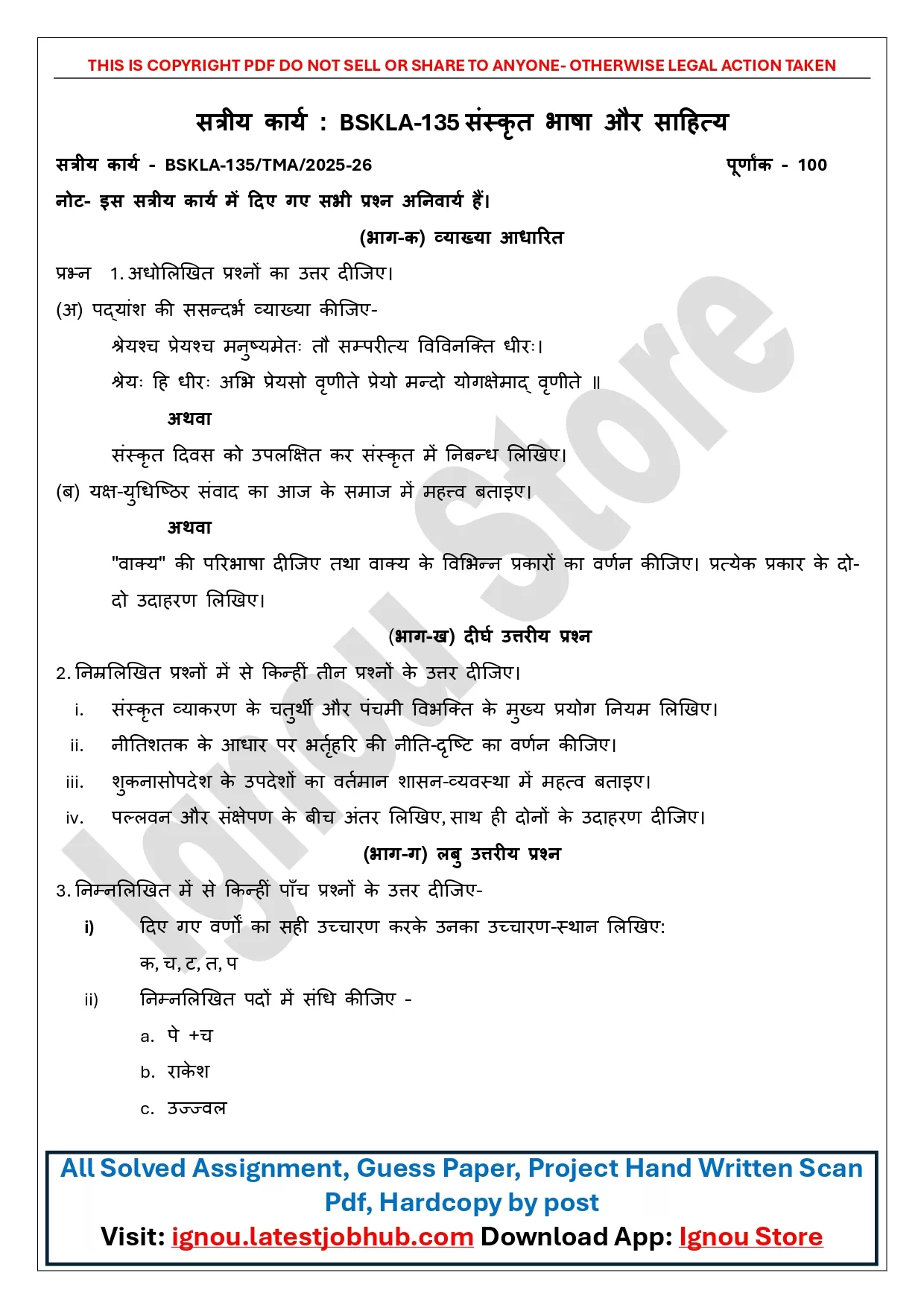 IGNOU BSKLA-135 Solved Assignment 2025-26 PDF | संस्कृत भाषा और साहित्य