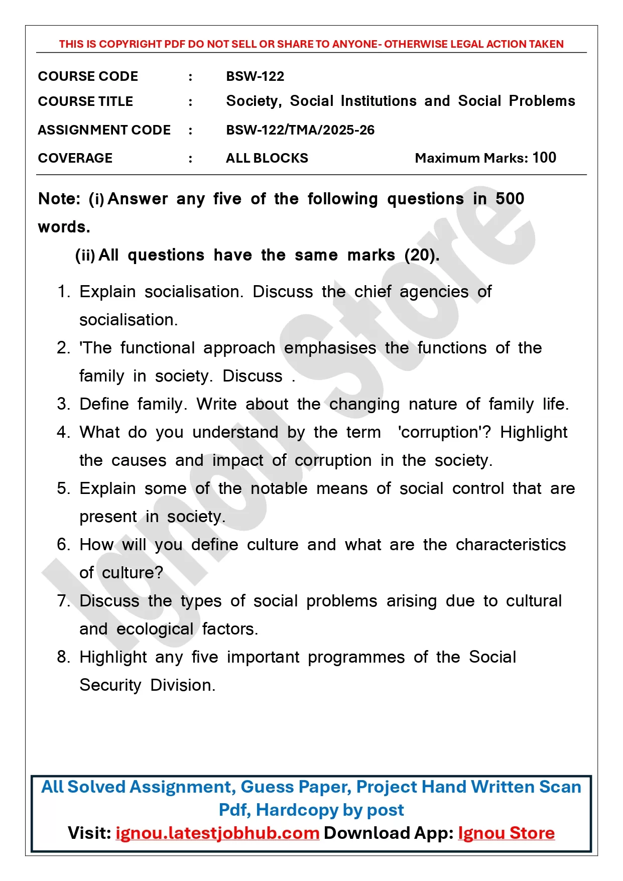 IGNOU BSW-122 Solved Assignment 2025-26 PDF | Society, Social Institutions and Social Problems